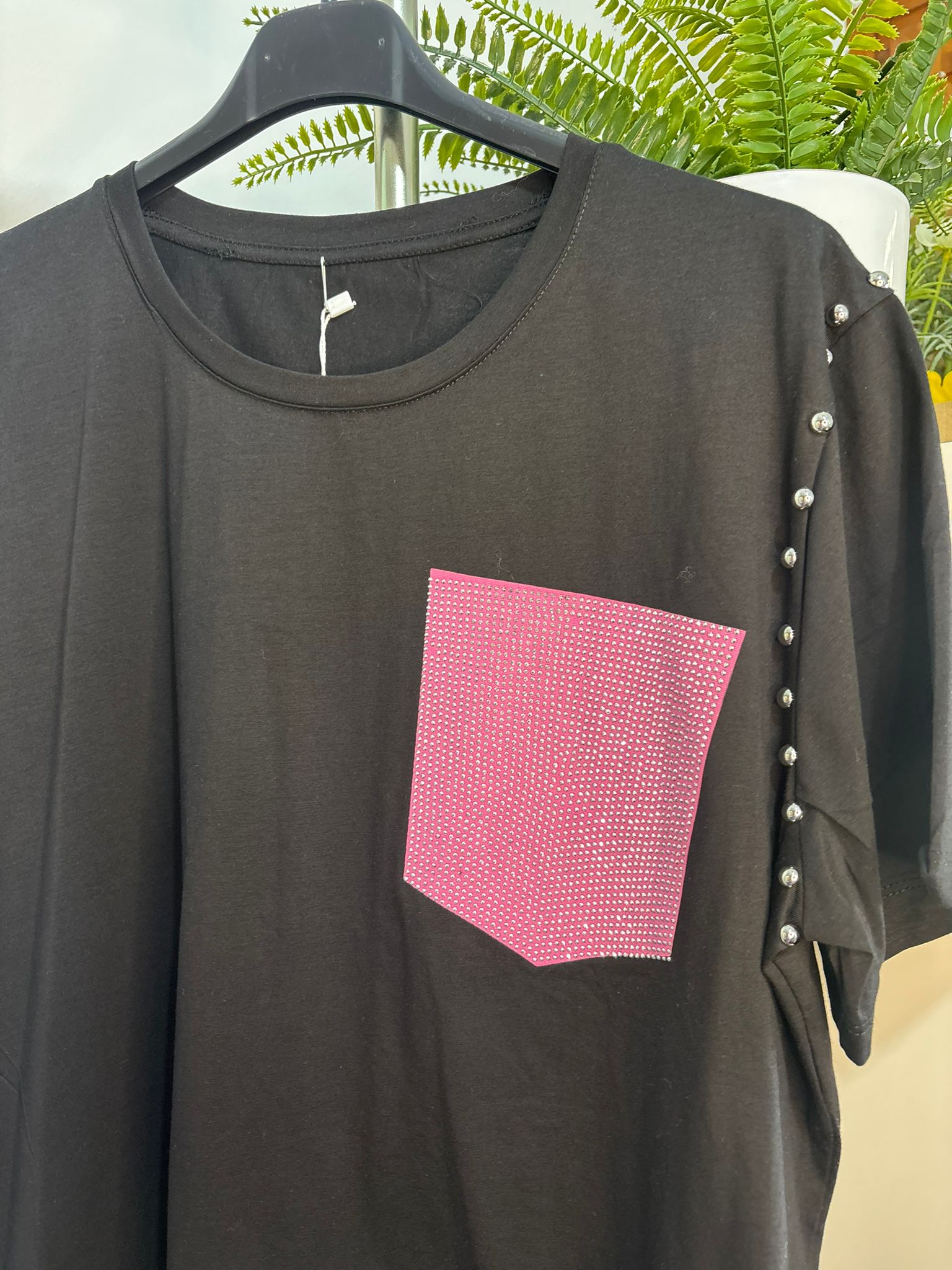 Camiseta negra con bolsillo rosa de brillantes en la manga lleva detalles de tachas TU y sirve para una S/36 , M/38 , L/40