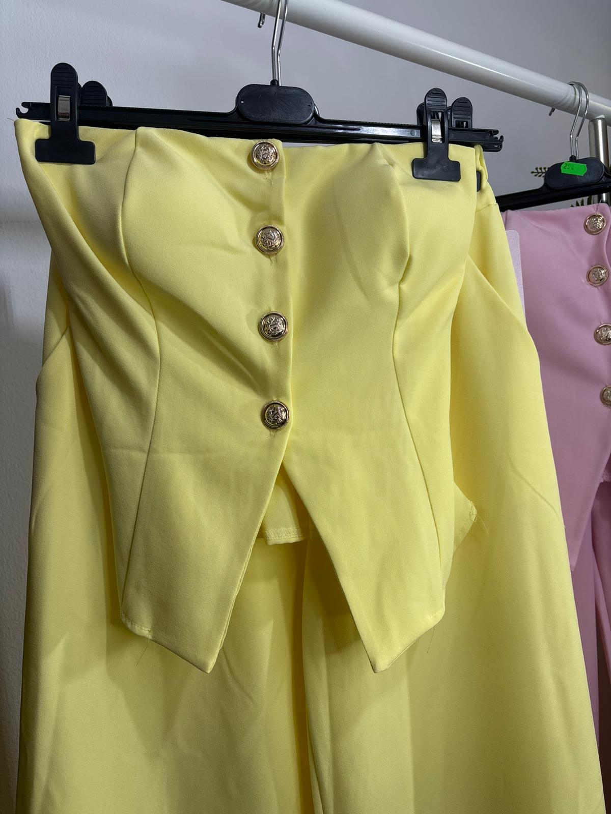 el top es palabra de honor con botones en color dorado y la parte de atrás es nido de abeja.