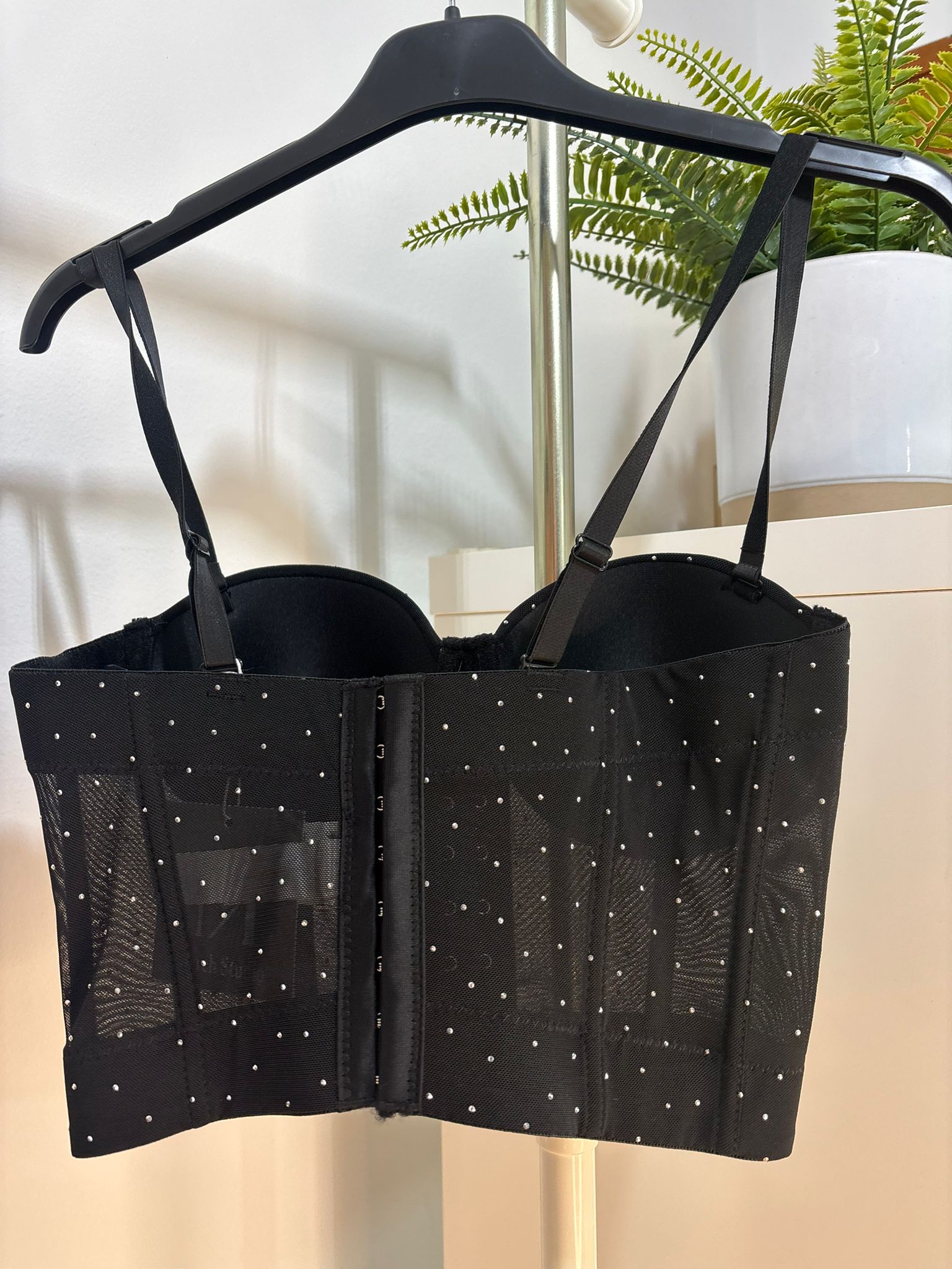 Corset negro con brillantes plateados copa que sirve hasta una 95 TU y sirve para una S/34 hasta una M/38
