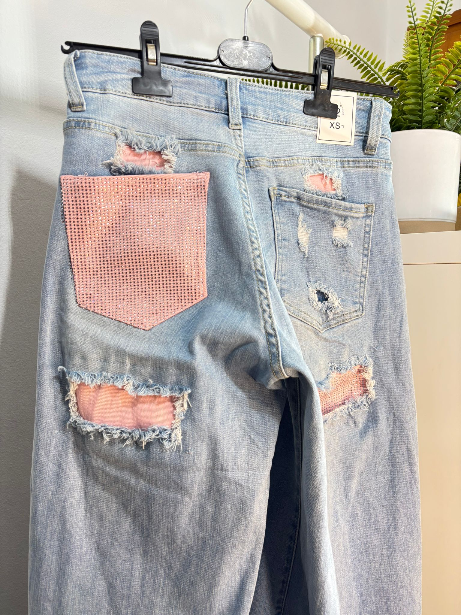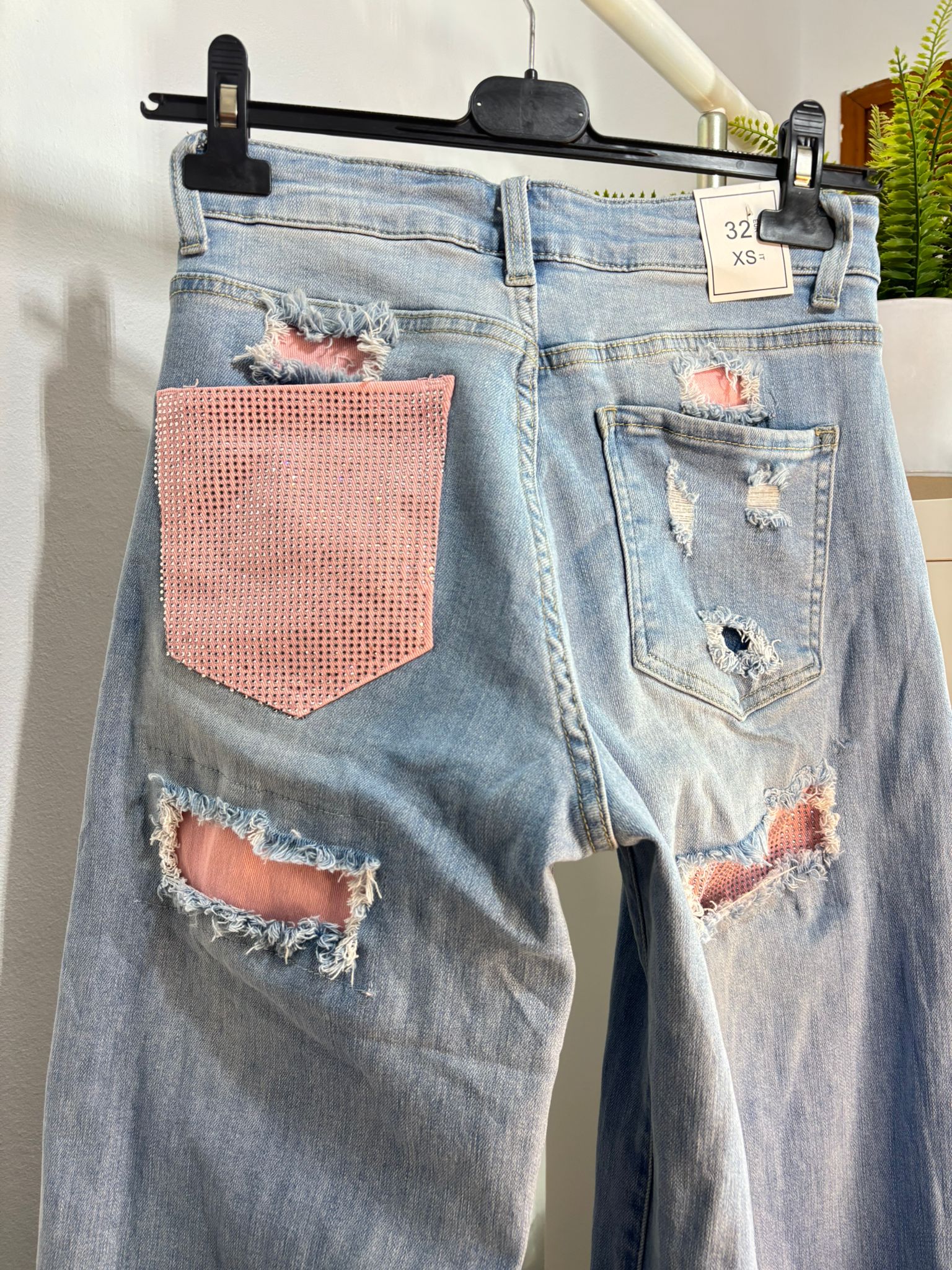 lleva 1 bolsillo rosa con brilli y detalles rotos